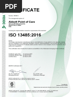 Abbott Point Of Care 3818614 Iso 13485 2016 Cert Add Jan 2018 Pdf Medicine Health Care